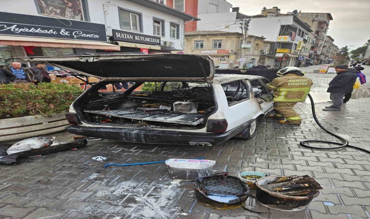Dakikalar içinde otomobilin iç mahallindeki dumanlar, yerini alevlere bıraktı. Çevredekilerin endişeyle izlediği araç, adeta alev topuna döndü.