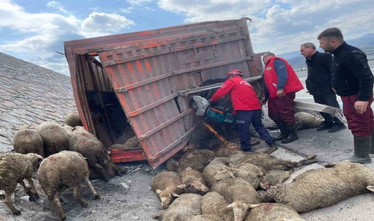 İtfaiye ekipleri tarafından tırın metal dorsesi kesilerek açıldı. Dorse içinde bulunan 100 küçükbaş hayvanın, 20’sinin telef olduğu öğrenildi.