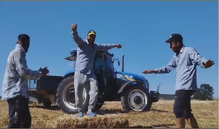 Yevmiyeli işe giden hamalların sıcak havada zorlu balya mesaisi eğlenceye dönüştü. Sıcaktan bunalan hamallara müzik yayını yapan tarla sahibinin telefonuyla kaydettiği görüntüler, sosyal medyada büyük beğeni topladı. Sıcak havaya aldırış etmeyen hamallar, saman balyalarını traktör römorkuna yüklerken, oynayarak eğlenceli vakit geçirdi.