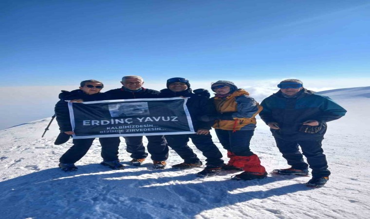 Zirveye çıkan dağcılar BANDAK bayrağı ile üzerinde Erdinç Yavuz’un fotoğrafının bulunduğu ve “Kalbimizdesin, bizimle zirvedesin” yazılı pankart açtı.