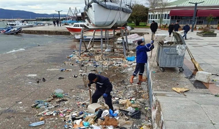 Balıkesir’in Bandırma ilçesinde fırtına nedeniyle deniz yükselince sahil bandı çöplüğe döndü.