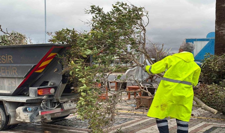 Bandırma’da fırtına sonrası sahilde ağaçların devrildiği ve çevreye zarar verdiği gözlemlenirken, Balıkesir Büyükşehir Belediyesi ekipleri temizlik ve onarım çalışmalarına hızla başladı. Ekipler devrilen ağaçları kaldırarak çevre güvenliğini sağlamak için yoğun çaba sarf etti. Erdek kırsalında ise yol kenarlarına savrulan ağaç dalları ve tabelaların, trafik güvenliğini tehdit ettiği bildirildi.