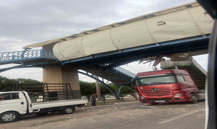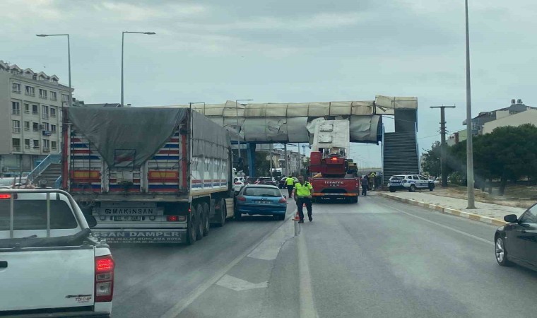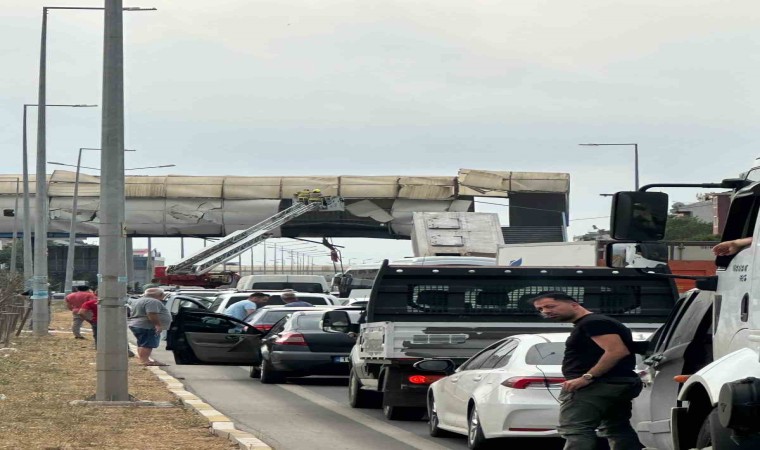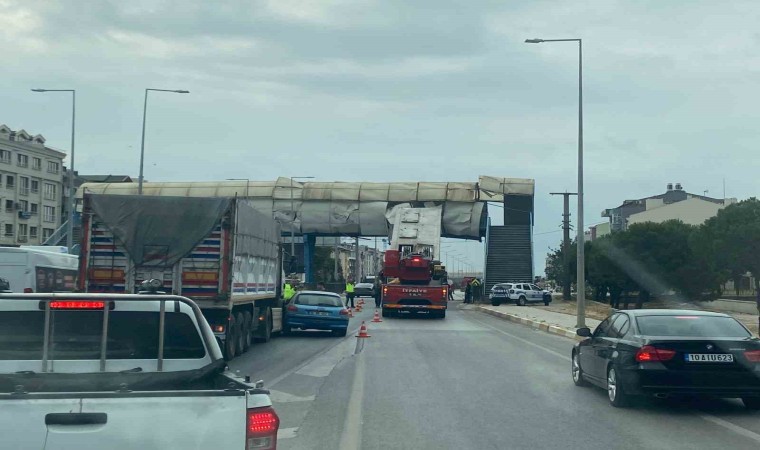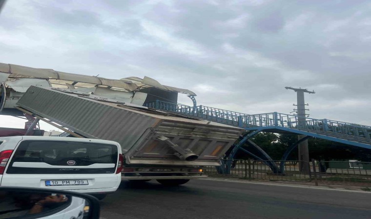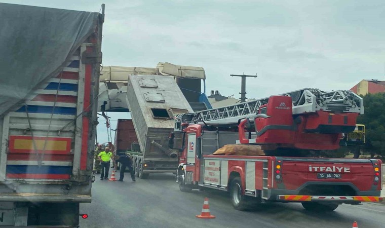Balıkesir’in Bandırma ilçesinde bir tırın dorsesinin açık kalması sonucu üst geçide çarptı.