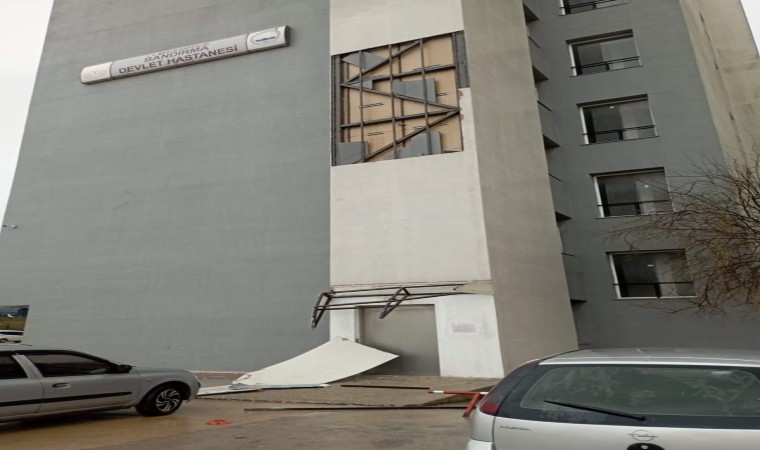 Balıkesir’in Bandırma ilçesinde etkili olan şiddetli rüzgar Bandırma Eğitim ve Araştırma Hastanesi’nin dış kaplamasını uçurdu.