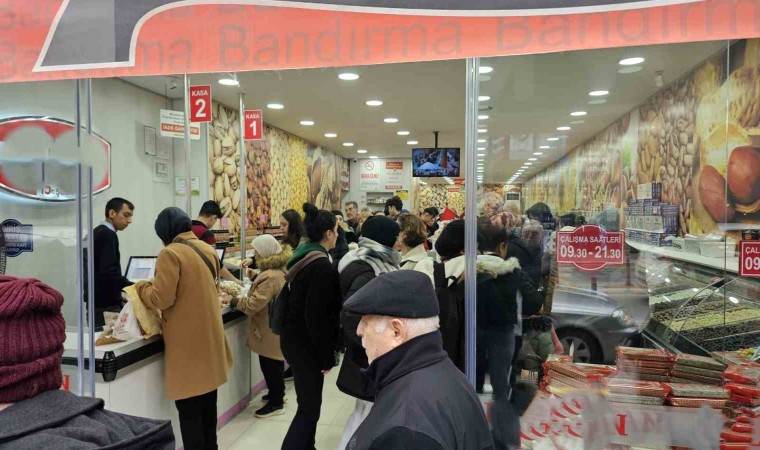 Bandırma’da yılbaşı gecesinin vazgeçilmezleri arasında yer alan kuruyemişler, esnafın yüzünü güldürmeye başladı. Kabuklu fıstık, badem, ceviz ve leblebi gibi ürünler yoğun ilgi görürken, dükkanların önünde uzun kuyruklar oluşuyor. Özellikle mağaza vitrinlerinde sergilenen özel yılbaşı paketleri vatandaşların dikkatini çekiyor. Esnaf, asıl yoğunluğun yılbaşına saatler kala yaşandığını belirtiyor.