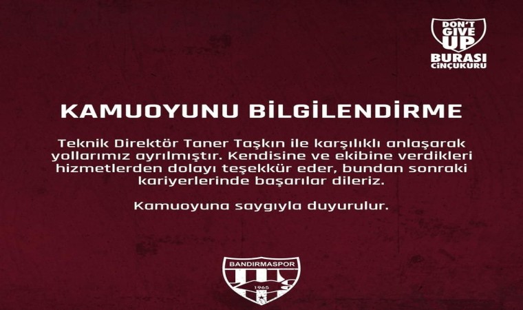 Bandırmaspor’un konuyla ilgili sosyal medya hesabından yapılan açıklamada, "Teknik Direktör Taner Taşkın ile karşılıklı anlaşarak yollarımız ayrılmıştır. Kendisine ve ekibine verdikleri hizmetlerden dolayı teşekkür eder, bundan sonraki kariyerlerinde başarılar dileriz" denildi.