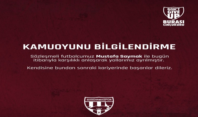 Bandırmaspor resmi sosyal medya hesapları üzerinden yapılan açıklamada; “Sözleşmeli futbolcumuz Mustafa Saymak ile karşılıklı anlaşarak yollarımız ayrılmıştır. Oyuncumuza bu zamana kadar ki emeklerinden dolayı teşekkür eder, bundan sonraki kariyerinde başarılar dileriz" denildi.