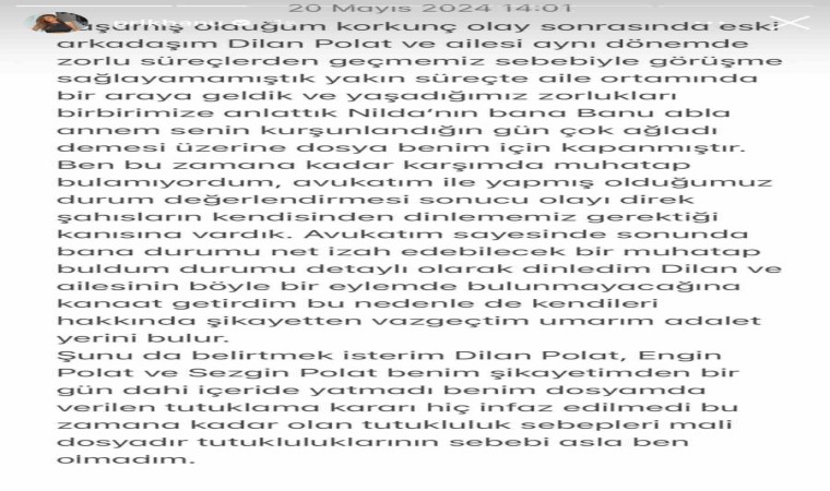 Bahçeşehir’deki güzellik merkezinin kurşunlanmasıyla ilgili Dilan ve Engin Polat’ın da aralarında bulunduğu sanıklar hakkında şikayetçi olan Banu Parlak, şikayetinden vazgeçti. Parlak, olaya ilişkin sosyal medya hesabından yaptığı açıklamada, “Dilan ve ailesinin böyle bir eylemde bulunmayacağına kanaat getirdim. Bu nedenle de kendileri hakkında şikayetten vazgeçtim. Umarım adalet yerini bulur. Şunu da belirtmek isterim Dilan Polat, Engin Polat ve Sezgin Polat benim şikayetimden bir gün dahi içeride yatmadı” dedi.