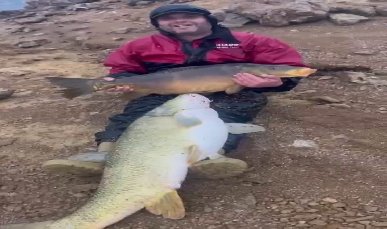 Elazığ’da bir vatandaş, baraj gölünde tuttuğu 30 ve 13 kiloluk balıkları ayağına bırakıp bebeği sallar gibi sallayarak ninni söyledi.