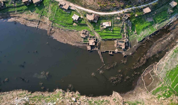 Diğer yandan 2018 yılında çekilen fotoğraflarda suyun altında olan evler, 2023 yılında su yüzeyinin üstünde kaldığı görüldü. Su seviyesinin düşmesiyle birlikte sular altında kalan yapılar dronla görüntülendi.
