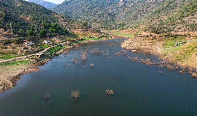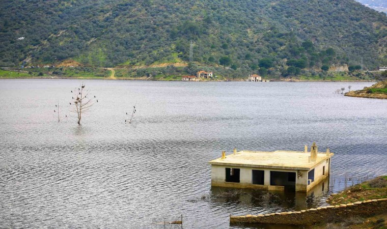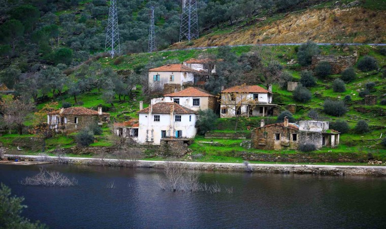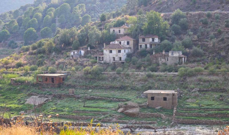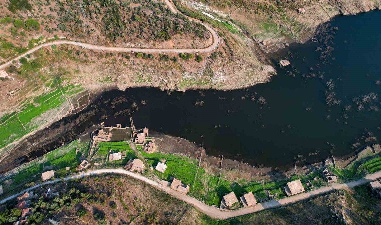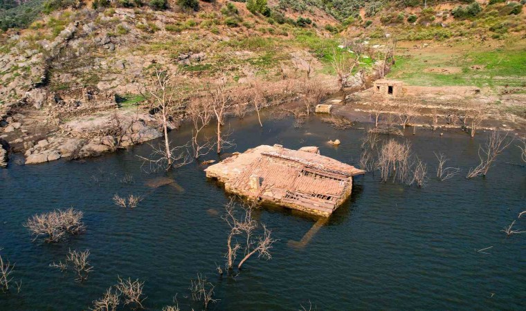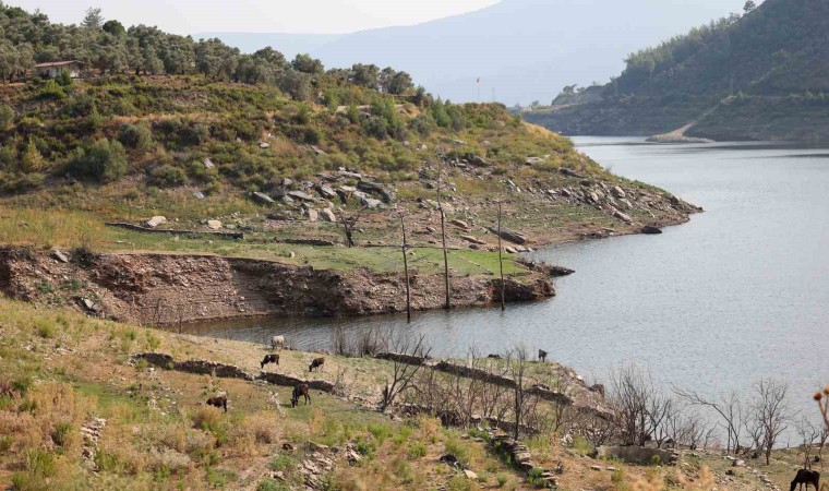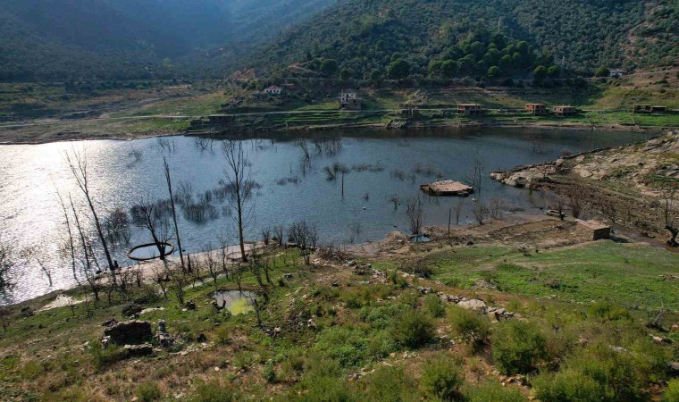 Muğla’da 8 bin 300 dekar tarım arazisinin sulanmasını sağlayan Milas Derince Barajındaki su seviyesinin düşmesi ile birlikte, baraj kıyısında bulunan eski köyün yapıları gün yüzüne çıktı.