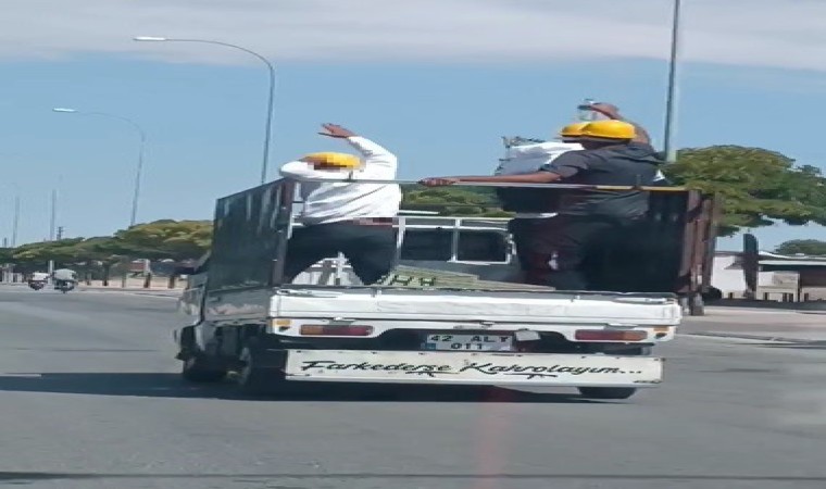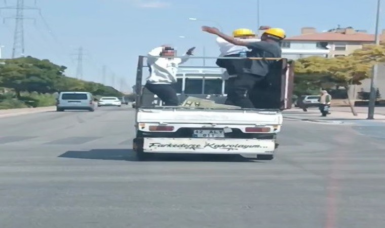 Konya’da seyir halindeki kamyonetin kasasında bulunan baretli 3 kişinin oynadığı anlar arkadan gelen araçtakilerin cep telefonu kamerasına yansıdı. Oynarken bareti uçan bir kişi ise yeni baret takarak oynamaya devam etti.