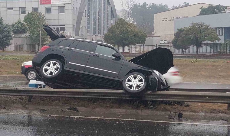 Tekirdağ’ın Süleymanpaşa ilçesinde kayganlaşan yolda refüje çarpıp bariyerde asılı kalan aracın sürücüsü yaralandı.