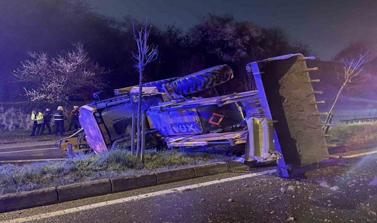 Öte yandan kaza sebebiyle polis ekiplerince trafikte araç geçişleri kontrollü olarak sağlandı. İş makinesini çekici vasıtasıyla refüjden kaldırılırken, trafik normal seyrine döndü.