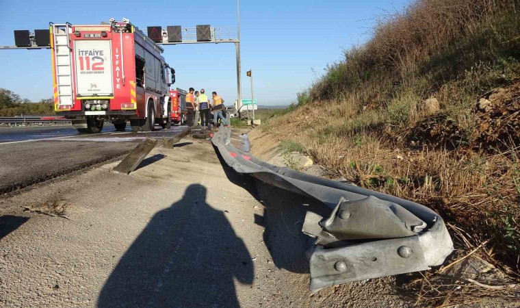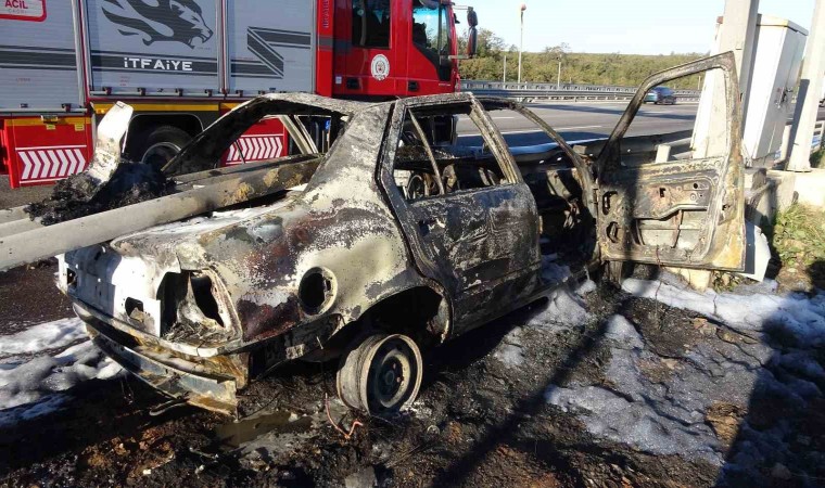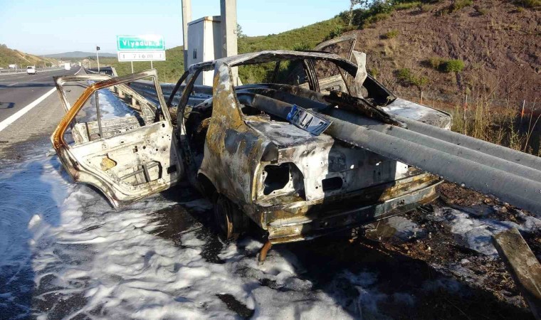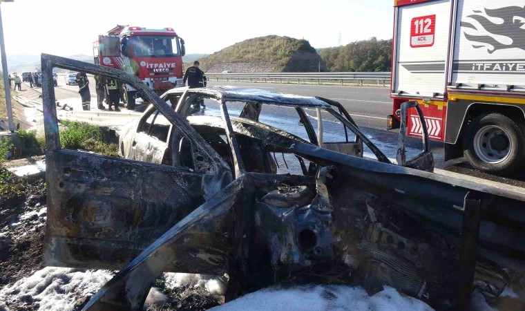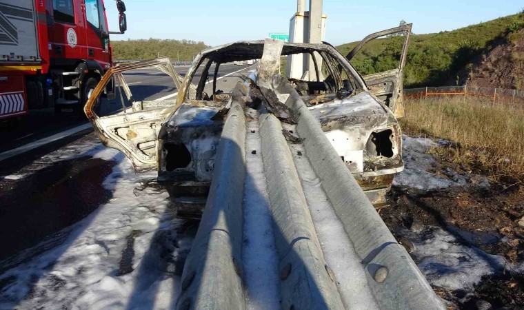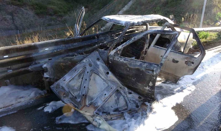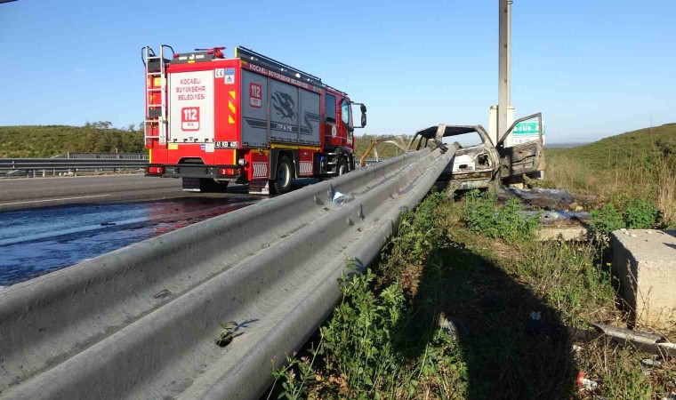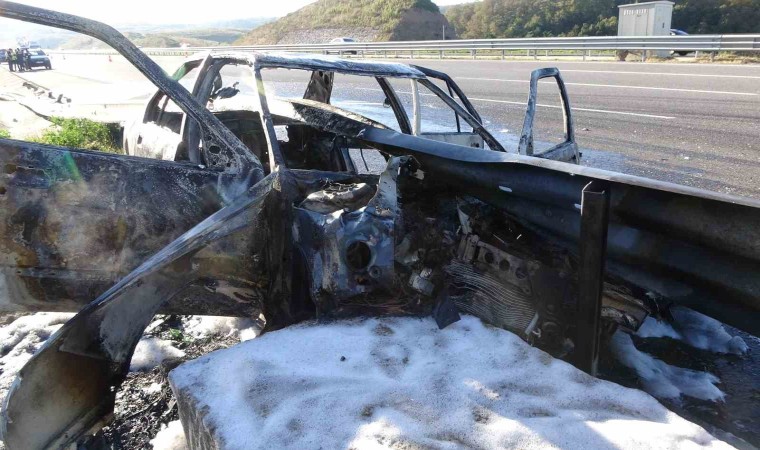 Kuzey Marmara Otoyolu’nun Kocaeli geçişinde meydana gelen kazada bariyer otomobilin önünden girip arkasından çıktı. Alev alan otomobilden geriye demir yığını kalırken, 3 kişi ölümden döndü.