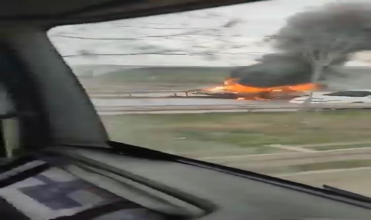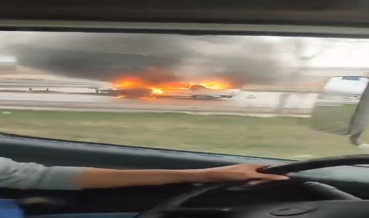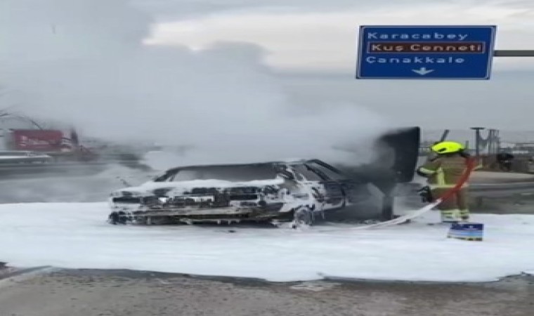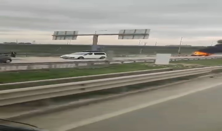 Çanakkale-Bursa karayolunda bariyere çarpan araç alev alev yandı. Yangın ekiplerin müdahalesiyle söndürülürken, araç kullanılmaz hale geldi.
