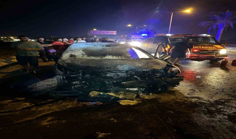 Manavgat Çevreyolu Köprüsünde bariyerlere çarpan otomobil itfaiyenin müdahalesine rağmen yanarak kullanılamaz hale geldi.