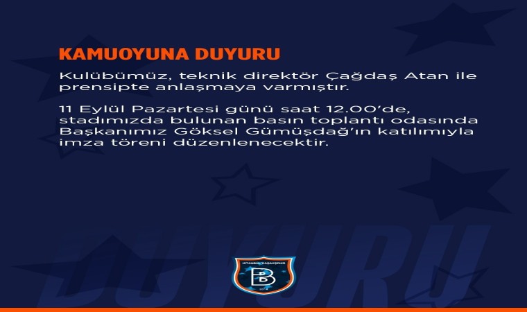 Trendyol Süper Lig’de bu sezon oynadığı 3 müsabakadan da mağlubiyetle ayrılan Başakşehir’de Teknik Direktör Emre Belözoğlu ile yolların ayrılmasının ardından takımın başına Çağdaş Atan getirildi. 43 yaşındaki çalıştırıcı için 11 Eylül Pazartesi günü imza töreni düzenlenecek. İstanbul ekibinin sosyal medya hesabından konuyla ilgili yapılan açıklamada, "Kulübümüz, Teknik Direktör Çağdaş Atan ile prensipte anlaşmaya varmıştır. 11 Eylül Pazartesi günü saat 12.00’de, stadımızda bulunan basın toplantı odasında Başkanımız Göksel Gümüşdağ’ın katılımıyla imza töreni düzenlenecektir" denildi.