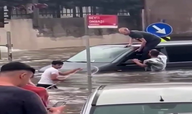 Başakşehir’de etkili olan sağanak yağış yolları göle döndürdü. Seyit Onbaşı Caddesi’nde suların yükselmesiyle araçlar mahsur kaldı. Aracın içerisinde kalan bir sürücü, şoför mahallinden cama çıkarak kurtarılmayı bekledi. Bu sırada bir kişinin ise sürüklenmemesi için aracı iple direğe bağladığı görüldü.