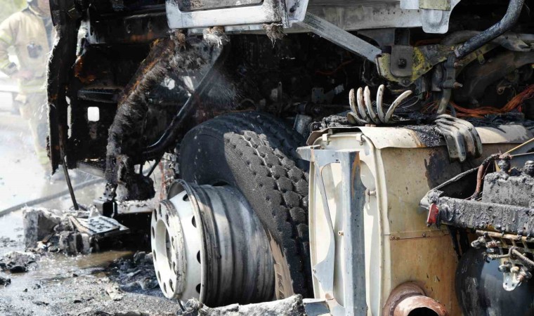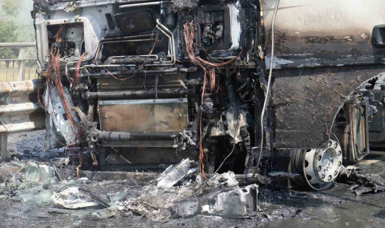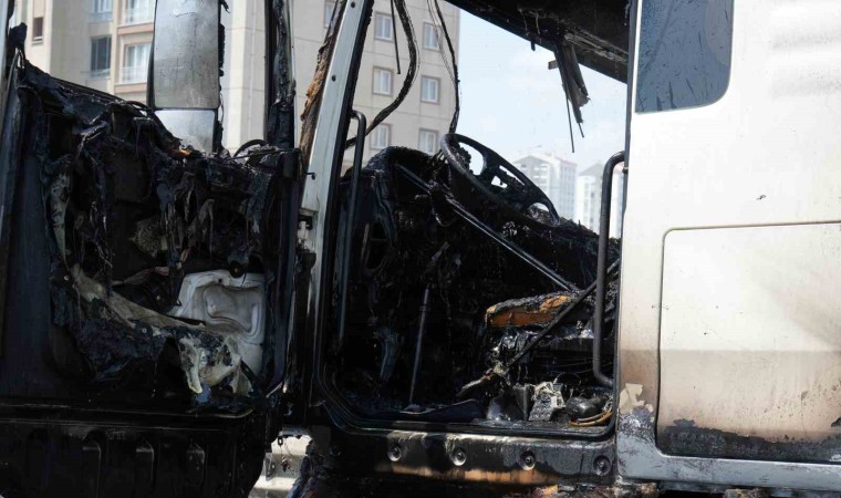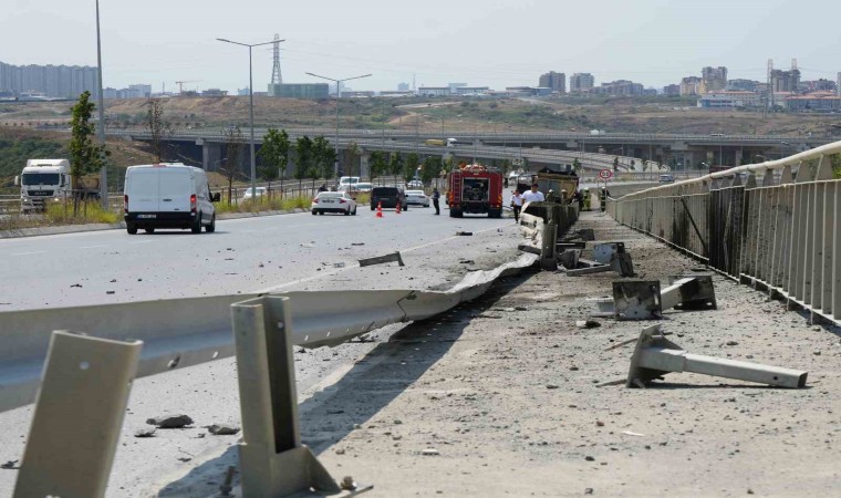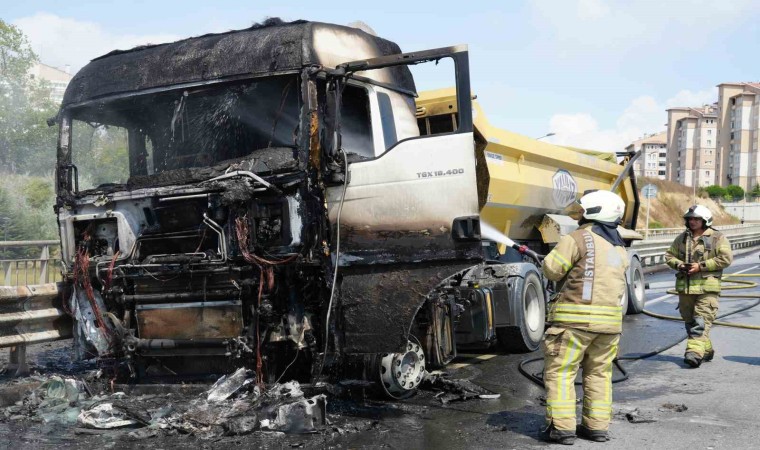 İstanbul’un Başakşehir ilçesinde lastiğinin patlaması sonucu bariyerlere çarpan hafriyat kamyonu, yaklaşık 800 metre sürüklenerek alev topuna döndü.