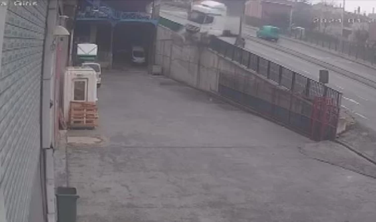Olay, cumartesi günü saat 10.00 sıralarında İkitelli Organize Sanayi Bölgesi Eski Turgut Özal Caddesi'nde meydana geldi. Caddeye girdiği sırada virajı alamayan TIR, önce refüje çıktı ardından bariyerleri aşarak 5 metre yükseklikten bir iş yerinin önüne düştü. Hafta sonu olması nedeniyle iş yerinin kapalı olması nedeniyle faciadan dönüldü. TIR şoförü yara almadan aracından çıktı. Kaza anı iş yerinin güvenlik kamerasına saniye saniye yansıdı.