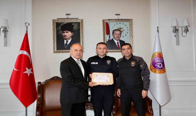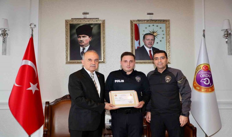 Ordu Valisi Muammer Erol, hakkında yakalama kararı çıkarılan şahsı 1 dakika içinde yakalayan polis memurlarını başarı belgesi vererek ödüllendirdi.