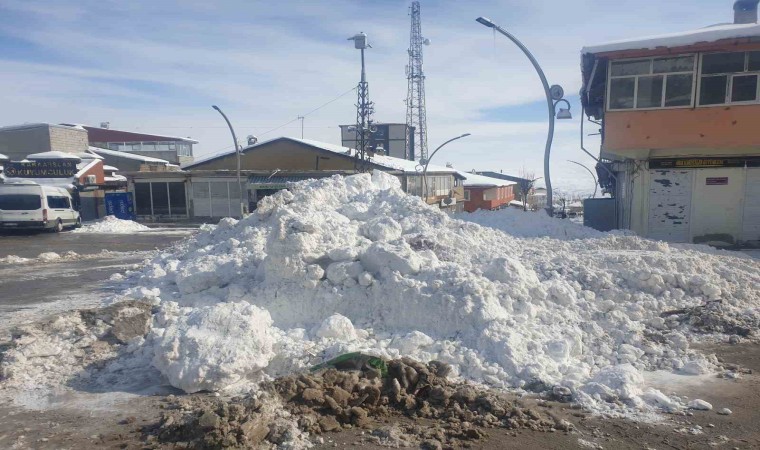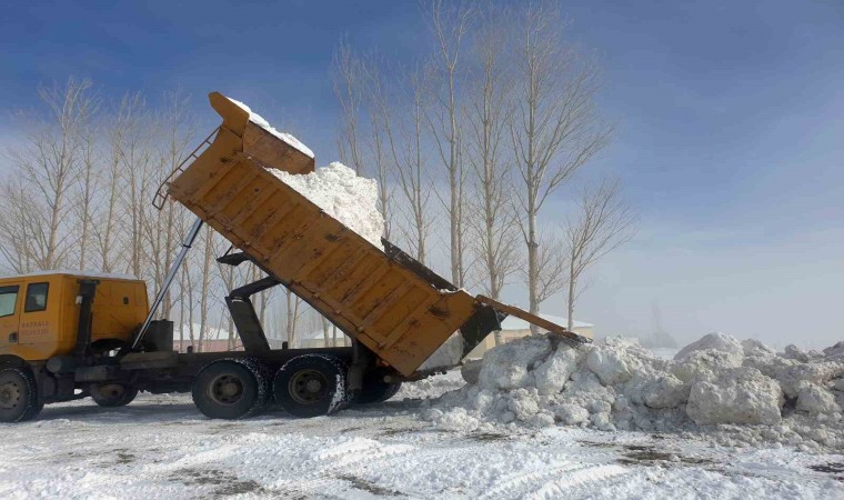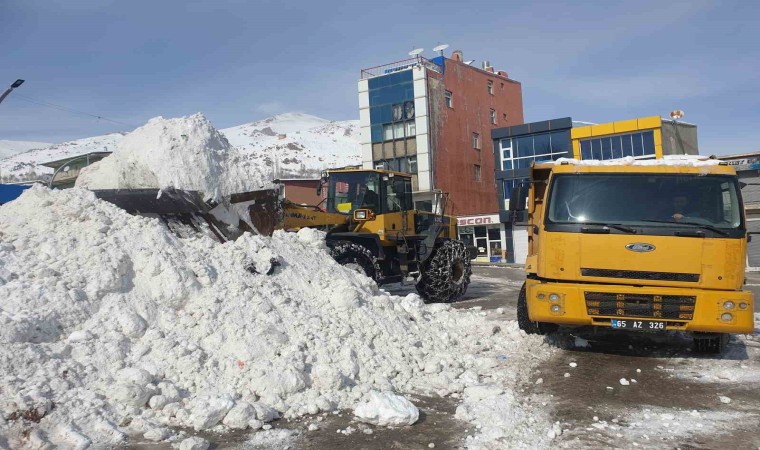 Van’ın Başkale ilçesinde bir metreyi geçen kar kalınlığının ardından başlatılan çalışmalar sonucunda iş makineleriyle toplanan kar yığınları kamyonlarla yerleşim yerinin dışına taşınıyor.