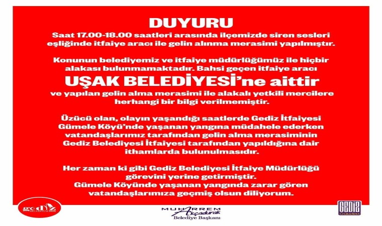 Akçadurak açıklamasının devamında, “Üzücü olan, olayın yaşandığı saatlerde Gediz İtfaiyesi Gümele Köyünde yaşanan yangına müdahale ederken vatandaşlarımız tarafından gelin alma merasiminin Gediz Belediyesi İtfaiyesi tarafından yapıldığına dair ithamlarda bulunulmasıdır.