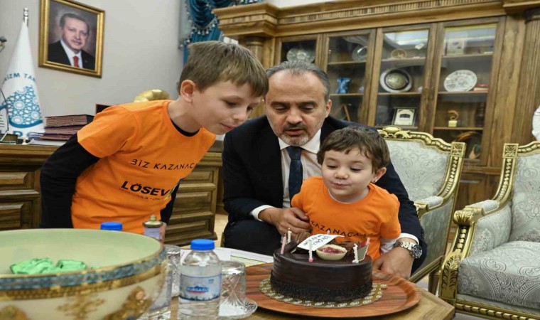 Lösemi hastalığına dikkat çekip bu konuda toplumda farkındalık oluşturmak amacıyla, 2-8 Kasım Lösemili Çocuklar Haftası etkinlikleri kapsamında Bursa’da da çeşitli etkinlikler düzenleniyor. Hafta etkinlikleri çerçevesinde Bursa LÖSEV İl Koordinatör Yardımcısı Aslı Sakarya, beraberindeki hastalıkla mücadele eden 3 küçük kahramanla birlikte Büyükşehir Belediye Başkanı Alinur Aktaş’ı makamında ziyaret etti. Küçük kahramanlarla sohbet eden Başkan Aktaş, onlara çeşitli hediyeler verip, birlikte pasta kesti.