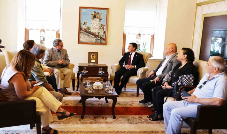 Nisyros Belediye Başkanı Prof. Dr. Christofis Koroneos, eşi Kaliopi, danışmanı Samis Paizanoglu ve eşi Yatağan Belediye Başkanı Mesut Günay ile birlikte Muğla Büyükşehir Belediye Başkanı Ahmet Aras’ı nezaket ziyaretinde bulundu. Ziyarette konuşan Muğla Büyükşehir Belediye başkanı Aras, “Ben Yatağan ile Nisyros Belediyesi arasında bir ilişki olduğunu duymuştum. Bu ziyaret beni ziyadesi ile mutlu etti. Ben Bodrum Belediye Başkanı iken de kentler arasındaki ilişkiyi çok önemsiyordum. Şu anda özellikle komşularımız ile olan ilişkileri maksimum seviyeye çıkarmak istiyorum. Bu konuda Rodos’a da bir mektup yazmıştım. En kısa zamanda ziyaretim öncelikle Bölge Başkanları nezdindeki ilişkileri tesis edeceğim. Çünkü kentlerin ilişkilerine ve diplomasisine çok önem veriyorum. Şu anda tüm dünyada 70 tane ülkeye ilişkileri güçlendirmek için mektup yazdım. Tabi ki özellikle bizim Yunanistan’a karşı farklı duygularımız var. Biz Mora Yarımadasından aile olarak Bodrum’a gelmişiz. Nasıl ki geleceğimiz için çalışıyorsak, geçmişimize de o kadar sahip çıkıyoruz. Bölgemiz Karia ve Likya uygarlıklarının yerleşim bölgesi. 110 antik kent barındırıyor burası” dedi.