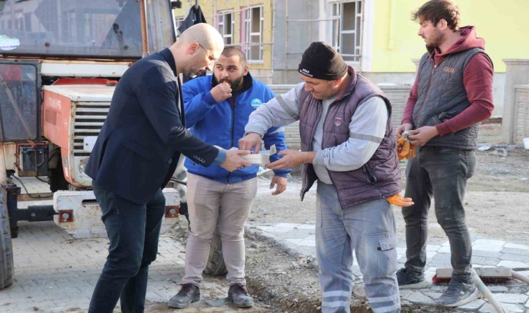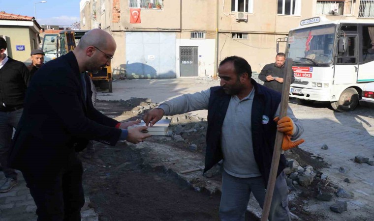 Söke’nin çeşitli noktalarında eş zamanlı yol yapım ve onarım çalışmalarını sürdüren belediye ekiplerinin çalışmaları hakkında sahada bilgiler alan Başkan Arıkan, belediye emekçilerine baklava ikram etti. Güzergahında Büyükşehir Belediyesi’nin personelini de es geçmeyen Söke Belediye Başkanı Dr. Mustafa İberya Arıkan, emeğin ve emekçinin yanında olduğunu bir kez daha gösterdi. Ayrıca eldivenleri giyen Başkan Arıkan, işçilerle birlikte yola parke taşı döşedi.