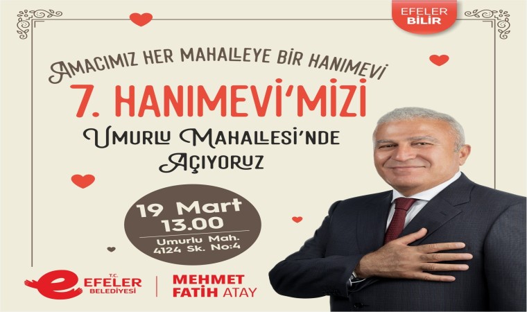 Efeler halkını çifte açılışa davet eden Başkan Mehmet Fatih Atay, “19 Mart Salı günü (bugün) saat 13.00’te Umurlu Mahallesi Aydın Denizli Karayolu üzerindeki Umurlu Halı Saha’mızı ve Umurlu Mahallesi 4124 Sokak No:4 adresindeki 7’nci Hanımevi’mizi hizmete açacağız. Tüm hemşehrilerimi açılış törenimize bekliyorum. Gelin bu heyecanı hep birlikte yaşayalım” dedi.