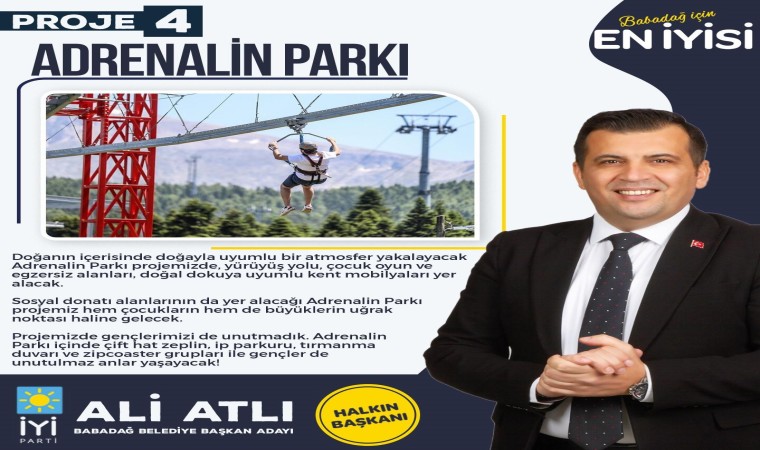 Babadağ Belediye Başkanı ve İYİ Parti Babadağ Belediye Başkanı Ali Atlı, Babadağ için yeni dönem projelerini Babadağlılara açıklamaya devam ediyor. Başkan Atlı yeni dönemde Babadağ için tasarlanan ’Adrenalin Parkı’ projesini anlattı. Amaçlarının ilçenin turizm alanında yeni bir tesise kavuşması olduğunu ifade eden Başkan Atlı, ilçeye gelecek turist sayısını artırmayı hedeflediklerini söyledi.