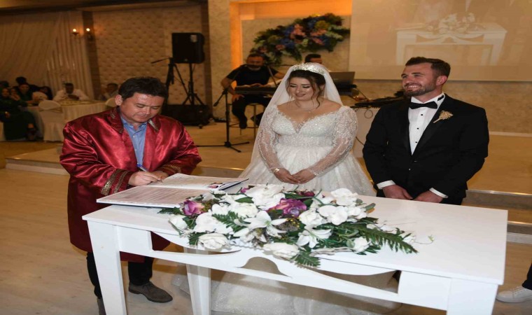 Yeni evli çifte esprili bir şekilde tavsiyelerde bulunan Başkan Aydın, “Damat bey, mutluluğun sırrı çok basit. Her zaman son sözü sen söyleyeceksin ve peki hanım diyeceksin. Bu şekilde bir ömür boyu mutlu olacaksın. Gelin hanım siz de nikah kıyılırken yaptığınız gibi damadın ayağına basacaksın, ancak damarına basmayacaksın. Allah çıktığınız bu yolda huzurla, mutlulukla ve birlik beraberlik içerisinde bir ömür nasip etsin. İnşallah, bir ömür boyu güzel bir hayat sizlerin olur” dedi. Başkan Aydın, nikah töreninin ardından evlilik cüzdanını gelin hanıma teslim etti.