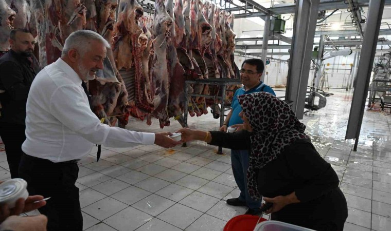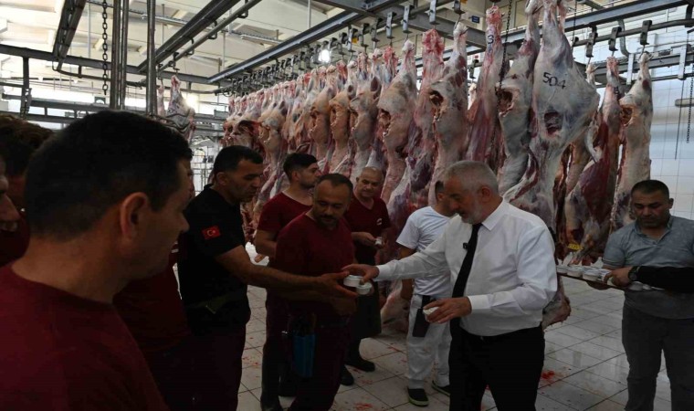 Başkan Başdeğirmen ziyaretinde, mezbahada görev yapan personele ve sıra bekleyen vatandaşlara bayram dondurması ikram etti.