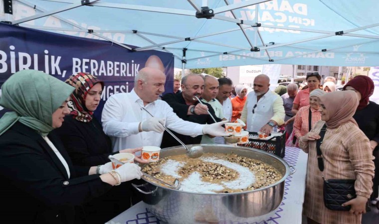 Darıca Belediye Başkanı Muzaffer Bıyık, aşure kazanın başına geçerek vatandaşlara aşure dağıttı ve beraberlik mesajı verdi.
