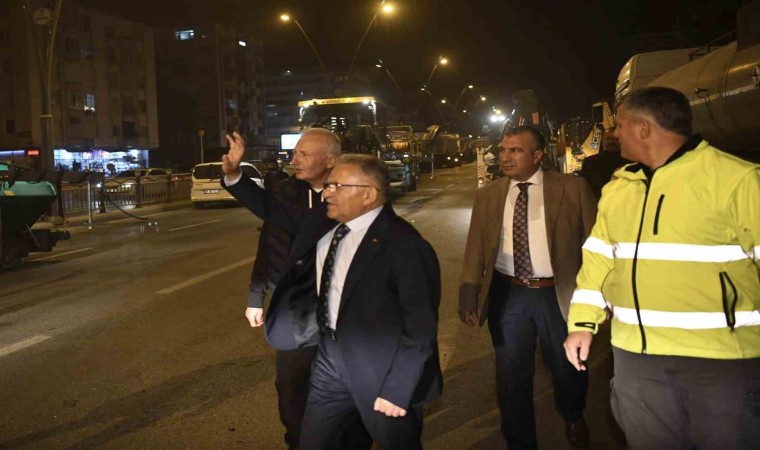 Kayseri Büyükşehir Belediyesi Fen İşleri Daire Başkanlığı ekipleri, kentin önemli ana arterlerinden biri olan ve gün içerisinde binlerce aracın geçiş yaptığı Mustafa Kemal Paşa Bulvarı’nda 1850 metre uzunluğundaki yolda 70 personel, 50 iş makinesi ile birlikte gece yarısı taş mastik aşınma tabakası serimi çalışmasına devam ederken, Büyükşehir Belediye Başkanı Dr. Memduh Büyükkılıç, fedakârca görev yapan personel ile bir araya geldi.