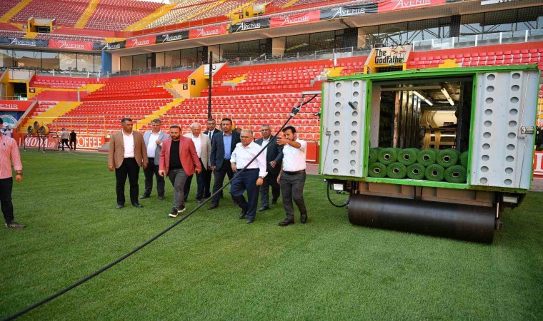 Stadyumda yapılan çalışmalarda, saha sıyırma işlemleri ile mevcut kotun 25 santimetre altına inilirken, temiz kum çekim işlemiyle de saha seviyesi 10 santimetre düşürülüp, lazer tesviye makinesi ile beşik çatı formatına getirildi. Toplam 7 bin 848 metrekare çim serimi yapılan stadyumda çimler, sürekli kendini yenileyen özelliğe sahip, doğal ve suni çimin birleşiminden meydana gelen hibrit sistem ile buluşturuldu.