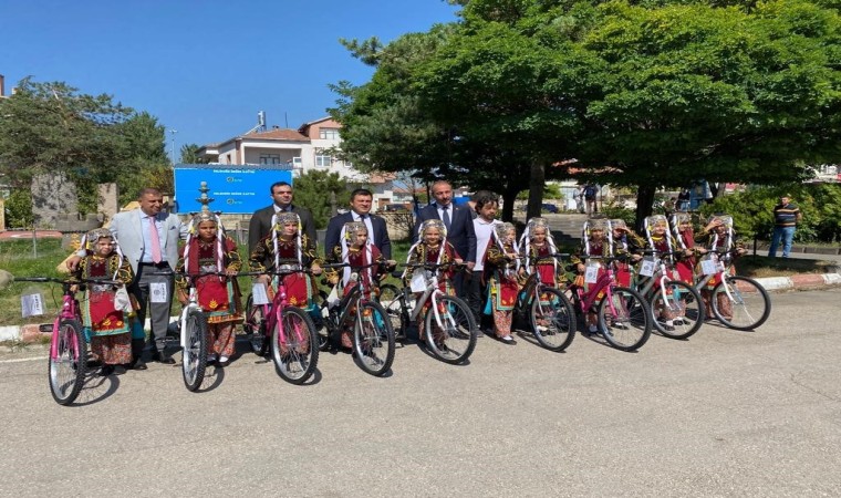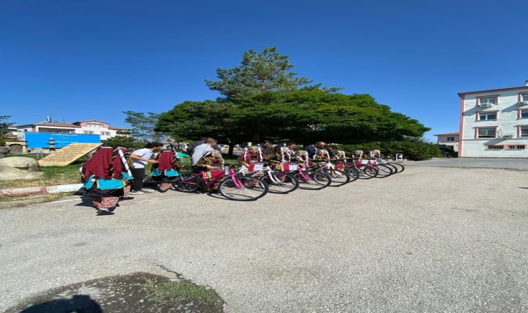 Halk oyunu kostümlerini giyen ve bisikletlerle poz veren öğrenciler, Başkan Büyükkılıç’a teşekkür ettiler.