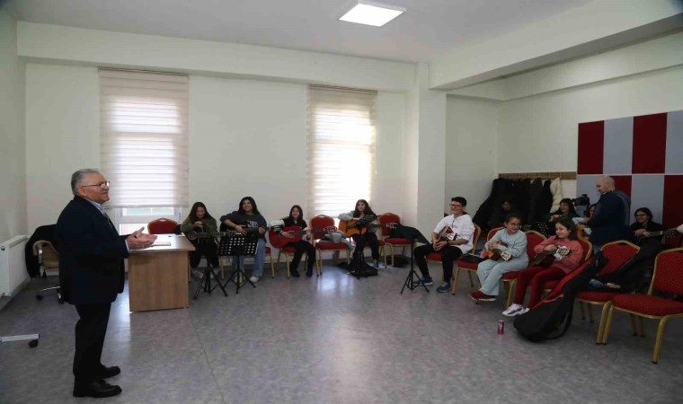 Kentte eğitim ve kursların hemen her türü ile her kademesinde görev üstlenmeye devam eden Büyükşehir Belediyesi, bu doğrultuda konservatuvar kurslarını da gençlerin hizmetine sunuyor. Bu çerçevede Büyükşehir Belediye Başkanı Dr. Memduh Büyükkılıç, Büyükşehir Belediyesi Sanat Akademisi’ni ziyaret etti. Yan flüt, bağlama, gitar, piyano, keman ve tiyatro kurslarını ziyaret eden Başkan Büyükkılıç, sınıf sınıf gezerek, çocuklarla ve gençlerle buluşurken, öğrenciler de Büyükkılıç’a gençlere yönelik bu tür hizmetlerinden dolayı teşekkür etti. İlk olarak bağlama öğrenen gençleri izleyen ve onlara eşlik eden Başkan Büyükkılıç; "Bu gençlik alkışlanır, ne kadar güzel. Bu yaş grubunda bir enstrüman öğreniyorsunuz. Okulları, eğitimi ihmal etmeden ‘ben de varım’ diyerek, tatil günlerini değerlendiriyorsunuz. KAYMEK de size her türlü ortamı sağlıyor, başarılar dileriz. Ailelerinize selamlar, bizlere güvendikleri için teşekkürler, sizleri tebrik ediyorum” diye konuştu. Büyükkılıç, daha sonra gitar kursu verilen sınıfa girerek, gitar çalan gençleri ilgiyle izleyip; "Sevgili yavrularımız sosyalleşme adına, okullardaki eğitime ilave olarak, farkındalık oluşturma adına bir enstrüman öğrenme arzunuza ve yeteneğinize hayranım. Sizleri kutluyorum, sağlıklı, hayırlı, uzun ömürler diliyorum" dedi. Ünlü sanatçı merhum Barış Manço’nun yerli ve milli anlayışın sahibi bir değer olduğunu söyleyen Başkan Büyükkılıç, şöyle konuştu;