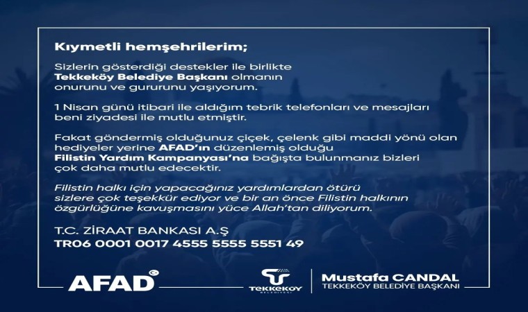 Tekkeköy Belediye Başkanı Mustafa Candal, sosyal medya hesabından yaptığı paylaşımda, “Sizlerin gösterdiği destekler ile birlikte Tekkeköy Belediye Başkanı olmanın onurunu ve gururunu yaşıyorum. 1 Nisan günü itibari ile aldığım tebrik telefonları ve mesajları beni ziyadesi ile mutlu etmiştir. Fakat göndermiş olduğunuz çiçek, çelenk gibi maddi yönü olan hediyeler yerine AFAD’ın düzenlemiş olduğu Filistin yardım kampanyasına bağışta bulunmanız bizleri çok daha mutlu edecektir. Filistin halkı için yapacağınız yardımlardan ötürü sizlere çok teşekkür ediyor ve bir an önce Filistin halkının özgürlüğüne kavuşmasını yüce Allah’tan diliyorum” ifadelerine yer verdi.