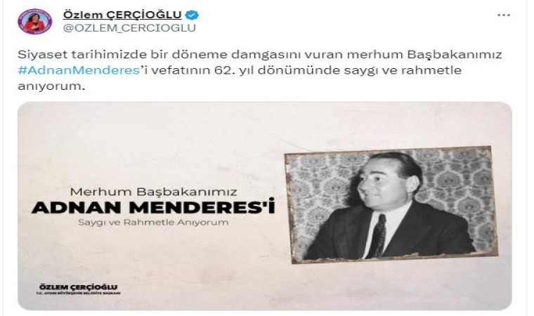 Merhum Başbakan Adnan Menderes’in idam edilişinin 62’nci yıldönümü nedeniyle paylaşım yapan Aydın Büyükşehir Belediye Başkanı Özlem Çerçioğlu; “Menderes siyaset tarihimizde bir döneme damgasını vurmuştur” dedi.