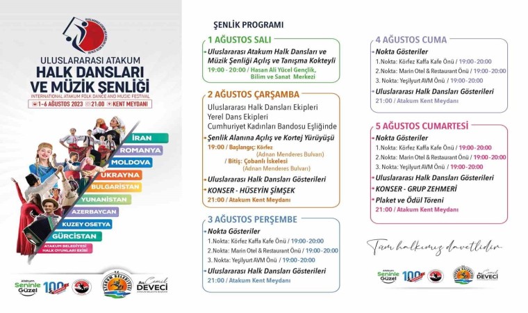 Samsun’un Atakum Belediye Başkanı Av. Cemil Deveci, 1-6 Ağustos tarihlerinde Atakum’da gerçekleştirilecek Uluslararası Atakum Halk Dansları ve Müzik Şenliği’ne davet ederek, “Beş gün boyunca şehrimiz ve bölgemiz sanatın kardeşlik diliyle bütünleşmiş olacak” dedi.
