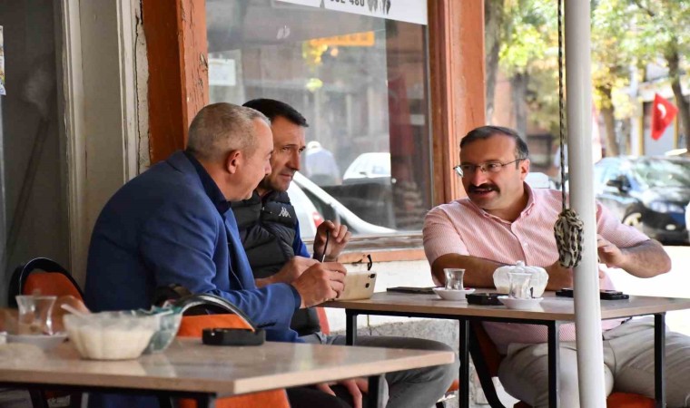 Emet Belediye Başkanı Hüseyin Doğan, halkla bir araya gelerek belediyenin gerçekleştirdiği çalışmalar hakkında bilgilendirmelerde bulunuyor.