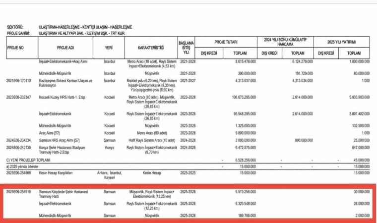 Samsun Büyükşehir Belediye Başkanı Halit Doğan, “Şehir Hastanesi Tramvay Hattı Projemiz 5 Ocak 2025 tarihinde Resmi Gazete’de yayımlanan ’2025 Yılı Yatırım Programı’na alındı. Proje, 6,5 milyar TL yatırım bedeliyle bu yıl yatırım programına ilk defa giren tek kent içi raylı sistem projesi oldu” dedi.