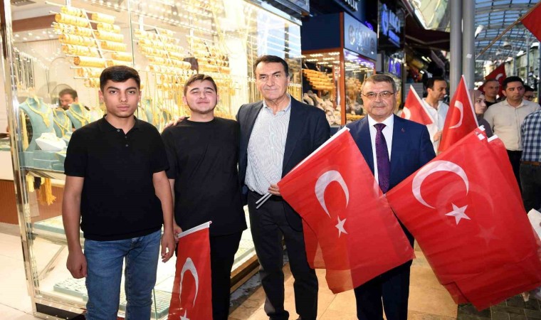 Osmangazi Belediyesi, Cumhuriyetin 100. yılı dolayısıyla ilçe genelini bayraklarla süslerken Belediye Başkanı Mustafa Dündar da esnafa Türk Bayrağı dağıttı.
