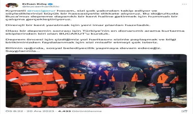 Buca’nın deprem ve risk haritasını İzmir Yüksek Teknoloji Enstitüsü iş birliğiyle çıkartarak, dirençli bir kent oluşturmak adına canla başla çalışan Buca Belediye Başkanı Erhan Kılıç, X sosyal medya platformundan yer bilimci Prof. Dr. Naci Görür’e çağrıda bulundu.