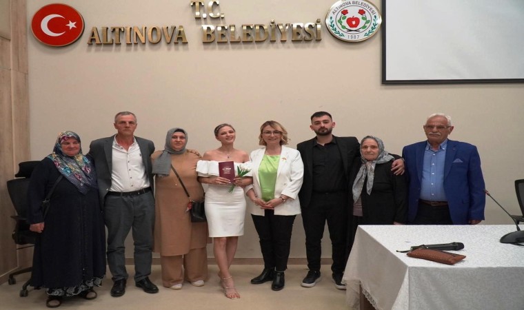 Altınova Belediye Başkanı Yasemin Fazlaca’nın ilk gün mesaisi, ilçenin tanınan ve sevilen gençlerinden Merve Çelik ve Özgür Palaşoğlu çiftinin nikahını kıymak oldu. Genç çifte ömür boyu mutluluklar dileyen Başkan yasemin Fazlaca, “Altınova Belediye Başkanı olarak göreve başladığım ilk günün heyecanını, sevgi dolu bir nikah töreniyle taçlandırmaktan büyük mutluluk duyuyorum. Benim için çok anlamlı olan bugünde sevgili çiftimiz Merve Çelik ve Özgür Palaşoğlu çiftimize bir ömür mutluluklar dilerim. Sevincinizi paylamak benim için çok anlamlıydı” diye konuştu.