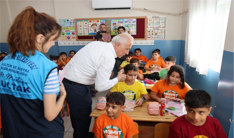 Şehit Savcı Mehmet Selim Kiraz Ortaokulu’na Akdeniz İlçe Müftüsü Necati Gündoğdu ile ziyarette bulunan Mersin’in merkez ilçe Akdeniz Belediye Başkanı Mustafa Gültak, öğrencilere Diyanet çocuk dergisini verdikten sonra sıralara oturarak öğretmen ve öğrencilerle sohbet etti.