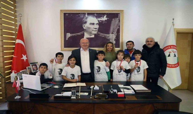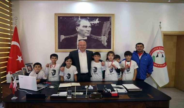 Büyük Atatürk Koşusunda dereceye giren sporcular, antrenörleri Erkan Karataş ve aileleri ile birlikte Menteşe Belediye Başkanı Bahattin Gümüş’ü ziyaret ettiler. Genç sporcuları ve antrenörlerini başarılarından dolayı tebrik eden Başkan Gümüş, “Belediyesporumuz bünyesindeki çocuklarımızın disiplinli çalışma ve doğru yönlendirme ile ne kadar başarılı olduklarını görüyor ve onlarla gurur duyuyoruz. Bizler çocuklarımıza genç yaşta spor bilinci, spor alışkanlığı kazandırmak ve geleceğin şampiyonlarını yetiştirmek için çalışıyoruz. Bu kapsamda belediyesporumuz bünyesindeki sporcularımız farklı branşlarda pek çok şampiyonluk ve dereceler kazanıyorlar. Çocuklarımızı sportif alanda yetişmelerine katkı sağlamaya devam edeceğiz” diye konuştu.